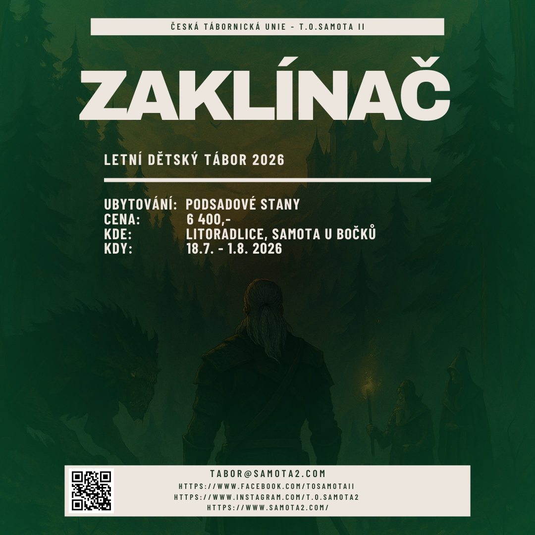 Letošní tábor nás zavede do drsného a přesto kouzelného světa Zaklínače – místa, kde se v temných lesích skrývají příšery, kde po stezkách putují elfové, trpaslíci i čarodějové a kde odvážní zaklínači bdí nad bezpečím celých království. Společně se vydáme po stopách dávných legend, naučíme se rozpoznávat magická znamení, vařit elixíry, luštit skrytá poselství a čelit výzvám, které prověří naši odvahu, chytrost i týmového ducha. Čekají nás příběhy staré jako samotné kontinenty, napínavé výpravy i tajemství, která dokáže odhalit jen opravdový hrdina. Tento rok bude plný magie, dobrodružství a nezapomenutelných okamžiků – staň se hrdinou i ty!